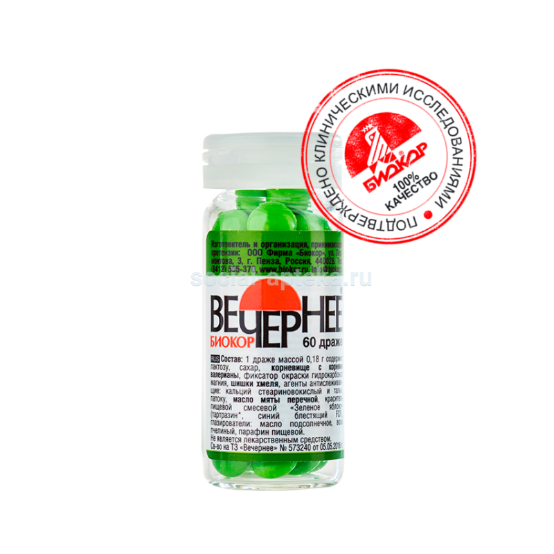 Благодаря природному комплексу веществ драже ВЕЧЕРНЕЕ обладает седативным, транквилизирующим, регулирующим сердечную деятельность и умеренными гипотензивными свойствами, является мягким спазмолитическим средством.ВАЛЕРИАНА оказывает многостороннее действие на организм. Она действует успокаивающе на возбужденную нервную систему. Валериана регулирует деятельность сердца, действуя через центральную нервную систему на приступы сердцебиения. Валериана улучшает секреторную функцию желудочно-кишечного тракта, снимает спазмы пищевода, помогает регулировать секрецию и выведение желчи.Терапевтическое действие валерианы обусловлено комплексом содержащихся в ней веществ, и, прежде всего, эфирным маслом и алкалоидами. В корневищах и корнях количество эфирного масла достигает 2 %.Препараты валерианы применяют в качестве успокаивающего средства при бессоннице, нервном возбуждении, неврозах сердечно-сосудистой системы, тахикардии, а также при эпилепсии, астме, мигрени, спазмах желудочно-кишечного тракта и в лечении нейродермитов. Иногда валериану используют в комбинации с препаратами брома, сердечными и успокаивающими средствами. В народной медицине валериану применяют в виде настоев, отваров, экстрактов и порошков. Настой корня употребляют в климактерическом периоде, после перенесенных заболеваний как улучшающее аппетит и общеукрепляющее средство.МЯТА восстанавливает силы, устраняет нервное перевозбуждение, нервозность вследствие дефицита сна. Уменьшает реактивность кожи при нервном перевозбуждении или контакте с раздражающими веществами, повышает защитные функции эпидермиса, выравнивает цвет кожи.Фармакологические свойства мяты: желчегонное, спазмолитическое, противовоспалительное, антисептическое, снижает процессы брожения и гниения в кишечнике, общеукрепляющее, ранозаживляющее, мочегонное.Оказывает спазмолитическое воздействие на сосуды головного мозга: при головокружении, тошноте, рвоте, укачивании в транспорте, при нарушении вестибулярного аппарата, оптимизирует мозговое кровообращение. Мята оказывает противовоспалительное и анальгезирующее действие при кариесе, воспалении десен, стоматите. Устраняет дурной запах изо рта, связанный с нарушением пищеварительного цикла. Купирует приступ изжоги, облегчает состояние при спазмах и колитах в желудке и кишечнике. Обладает противовирусной активностью. Ликвидирует мышечные боли. Делает менее болезненной менструацию. ХМЕЛЬ - содержит целлюлозу, пектин, глюкозу, фруктозу, органические и минеральные кислоты: яблочную, лимонную, янтарную, щавелевую, фосфорную, кремниевую, соли меди, железа, серы, аминокислоты.Соплодия (шишки) содержат эфирное масло, горькое вещество липулин, аскорбиновую, хмеледубильную, гумуленовую и валериановую кислоты, триметиламин, смолу, камедь, красящее и дубильные вещества, холин, горечи, гипоксантин, воск, фитонциды. Препараты хмеля оказывают успокаивающее, мочегонное, противовоспалительное, спазмолитическое и болеутоляющее действие. Применяют их при повышенной нервной и половой возбудимости, бессоннице, неврастении, радикулитах, заболеваниях почек, болезненных менструациях, ночных поллюциях, климаксе. Особенно эффективны при циститах и уретритах. Хмель применяют при неврозах, истерии, невралгиях, головной боли, отсутст
