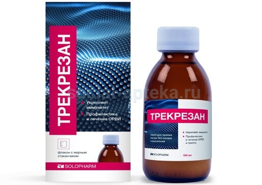 1 мл сиропа содержит: оксиэтиламмония метилфеноксиацетат (трекрезан) 20 мг.