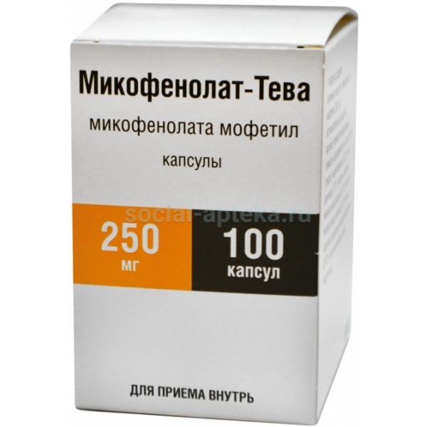 Микофенолат-Тева - иммунодепрессивное средство. Фармакодинамика Селективно ингибирует инозинмонофосфатдегидрогеназу и тормозит синтез гуанозин нуклетоида de novo. Оказывает выраженный цитостатический эффект на лимфоциты, подавляет их пролиферацию в ответ как на митогенную, так и на аллоспецифическую стимуляцию. Угнетает также образование антител B-лимфоцитами. Предотвращает гликозилирование лимфоцитарных и моноцитарных гликопротеинов, участвующих в межклеточном взаимодействии с эндотелием, и уменьшает миграцию лимфоцитов в очаги воспаления и отторжения трансплантата, блокирует воздействие мононуклеаров на синтез ДНК и пролиферацию. Фармакокинетика При приеме внутрь быстро всасывается и полностью пресистемно гидролизуется, образуя микофеноловую кислоту (активный метаболит). Абсолютная биодоступность ее составляет 94% (в плазме практически не обнаруживается мофетила микофенолат). Время достижения Cmax (24,5 мкг/мл) составляет 0,8–0,9 ч. В ранние сроки (первые 40 дней после аллотрансплантации почки) Cmax и время достижения ее примерно на 50% ниже. Микофеноловая кислота на 97% связана с альбумином плазмы. Средний объем распределения — 3,6–4,0 л/кг. В тканях превращается в глюкуронид (связывается с альбумином — 82%). При высокой концентрации в плазме глюкуронида возможна конкуренция за места связывания с белками. Через 6–12 ч в крови определяется второй пик, обусловленный энтерогепатической циркуляцией. Т1/2 составляет 17,9 ч, плазменный Cl — 193 мл/мин. Почками выводится около 87% введенной дозы, кишечником — 6%. Экскретируется главным образом глюкуронид, в моче обнаруживаются еще 3 метаболита и менее 1% микофеноловой кислоты.