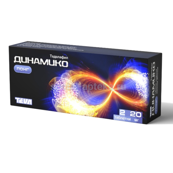 Внутрь, независимо от приема пищи. Эректильная дисфункция Рекомендованная доза составляет 10 мг перед предполагаемым половым актом. У пациентов, у которых препарат ДИНАМИКО ЛОНГ в дозе 10 мг не эффективен, применяют дозу 20 мг. Препарат ДИНАМИКО ЛОНГ необходимо принять, по крайней мере, за 30 минут до сексуальной активности. Максимальная частота приема препарата ДИНАМИКО ЛОНГ составляет 1 раз в день. Дозы 10 мг и 20 мг применяют непосредственно перед сексуальной активностью и не рекомендуются для ежедневного применения. Для пациентов с частой сексуальной активностью (более двух раз в неделю) рекомендуется применение препарата ДИНАМИКО ЛОНГ в дозе 5 мг ежедневно, 1 раз в сутки в одно и то же время. Суточная доза может быть снижена до 2,5 мг в зависимости от индивидуальной чувствительности. Для пациентов с нечастой сексуальной активностью (реже 2 раз в неделю) рекомендовано применение препарата ДИНАМИКО ЛОНГ в дозе 20 мг непосредственно перед сексуальной активностью. Максимальная суточная доза 20 мг. Особая группа пациентов У пожилых пациентов коррекция дозы не требуется. У пациентов с легкой или умеренной почечной недостаточностью коррекция дозы не требуется. Максимальная доза у пациентов с тяжелой почечной недостаточностью составляет 10 мг. Ежедневное применение (более 2 раз в неделю) препарата ДИНАМИКО ЛОНГ у пациентов с тяжелой почечной недостаточностью не рекомендовано. У пациентов с легкой и умеренной печеночной недостаточностью рекомендованная доза препарата ДИНАМИКО ЛОНГ составляет 10 мг. Применение дозы более 10 мг у пациентов с нарушением функции печени не оценивалось. Недостаточно данных о применении препарата ДИНАМИКО ЛОНГ при тяжелой печеночной недостаточности (по шкале Чайлд-Пью класс С). Следует соблюдать осторожность при применении препарата ДИНАМИКО ЛОНГ в этой группе пациентов. Пациенты с сахарным диабетом При применении у пациентов с сахарным диабетом коррекция дозы не требуется.