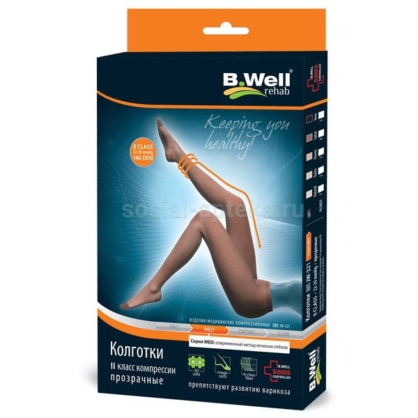 Колготки компрессионные B.Well rehab JW-321, 2 класс компрессии (22-32 мм рт. ст). для улучшения венозного оттока при заболеваниях вен, хронической венозной недостаточности, для профилактики тромбоза глубоких вен. Механизм действия трикотажа основан на распределенном давлении: максимальное в области щиколотки 22-32 мм. рт.ст., уменьшается в области голени, в области бедер компрессия минимальна. Регулярное ношение компрессионного трикотажа: Нормализует кровоток в нижних конечностях Способствует перераспределению кровотока в глубокие вены Улучшает работу венозных клапанов Уменьшает нагрузку на сердечно - сосудистую систему Препятствуют развитию варикоза - 3D вязка - специальная вязка «объемными сотами» помогает сохранить естественный влаго- и теплообмен кожи, обеспечивает высокий комфорт ношения - Нити класса «А» - комплексные нити с двойной S-образной оплёткой во встречных направлениях обеспечивают необходимый компрессионный эффект и прочность - Комфортные шортики с мягкой текстурой, гигиенической ластовицей обеспечивают удобство ношения и хорошее прилегание - Массажный эффект - особое плетение на стопе обладает массажным эффектом, воздействует на биоактивные точки стопы, уменьшает усталость и стимулирует кровообращение - Усиленная стопа - усиленная носочная и пяточная части плотно фиксируются на стопе и уменьшают риск случайных повреждений, плоские мягкие швы обеспечивают комфорт ношения Гарантийный срок: 6 месяцев на сохранение медицинских свойств (гарантия отсчитывается с момента продажи изделия) Гарантийными случаями не являются: механические повреждения (включая случайные) повреждения, вызванные использованием товара не по назначению дефекты, возникшие как следствие нарушения правил и условий эксплуатации или хранения, правил ухода за изделием несанкционированные внесения изменений в конструкцию Гарантия не распространяется на упаковку.
