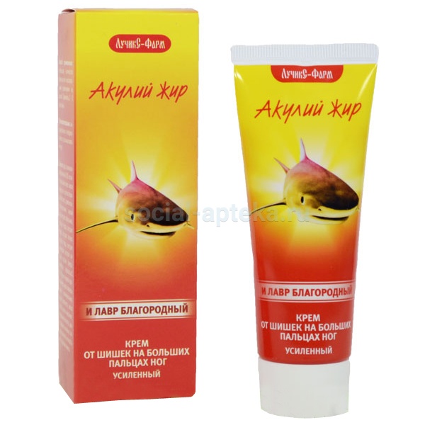 АКУЛИЙ ЖИР КРЕМ ЛАВР БЛАГОРОДНЫЙ Д/НОГ 75МЛ Шишками называют распухшие суставы больших пальцев ног, которые образуются при продольном плоскостопии. Появляются они, когда между большим пальцем и стопой разрастается костная и хрящевая ткани. Распухший сустав часто болит, отекает, в этом месте появляются мозоли, воспаления. Высокий каблук и тесная обувь ускоряют процесс образования шишек. Крем разработан специально для профилактики и борьбы с шишками на пальцах ног. Снимает боль в очаге воспаления, размягчает хрящевые и мозолистые образования, создает условия для безболезненного перхода на более подходящую обувь. При длительном применении крем решит проблему "шишек" на больших пальцах ног. Чтобы уменьшить боль, используйте акулий жир и лавр благородный как крем от шишек. Снижение болезненных ощущений обусловлено наличием в креме таких веществ: жир печени акулы; экстракт лавра и других трав; эфирные масла лекарственных растений; муравьиная кислота. Благодаря наличию муравьиной кислоты и экстракта лавра хрящевая ткань размягчается, что снижает давление на стопу. При длительном применении средства можно полностью избавиться от выпирания косточки.