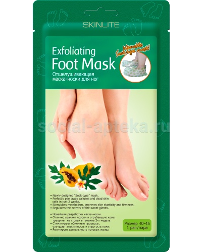 SKINLITE Отшелушивающая маска-носки для ног – это инновационный продукт, который сочетает в себе глубокий пилинг стоп и долговременный оздоравливающий эффект. Это эффективное средство для удаления мозолей, натоптышей и потрескавшейся кожи на стопах, предотвращающее огрубление кожи и образование новых трещин. Гликолевая и цитрусовая кислоты способствуют безболезненному и естественному удалению отмерших клеток. Натуральные экстракты папайи и яблока оказывают смягчающее, увлажняющее и восстанавливающее действие. Экстракт ромашки успокаивает кожу. Форма маски в виде носков делает процедуру простой и приятной. Уже через 7 дней кожа Ваших ног станет гладкой и нежной, как у младенца, а полученный результат сохранится на 2-3 месяца. универсальный размер – 40-45