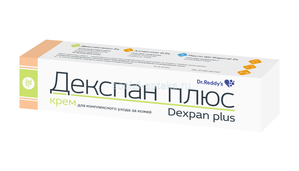 Декспан Плюс крем - комплексное средство, разработанное для ухода за сухой повреждённой кожей. Комбинация двух активных веществ, декспантенола и аллантоина, способствует заживлению, восстановлению и активному увлажнению повреждённой кожи при трещинах, ожогах (в т.ч. солнечных), опрелостях, сухих дерматитах. Декспантенол 5% Стимулирует процесс регенерации тканей, нормализует клеточный метаболизм, оказывает ранозаживляющее действие. Аллантоин 0,5% Смягчает и увлажняет кожу, устраняя сухость и шелушение. Обладает противовоспалительным действием. Масло Ши Стимулирует синтез коллагена. Оказывает смягчающее, увлажняющее и успокаивающее действие на сухую и повреждённую кожу.