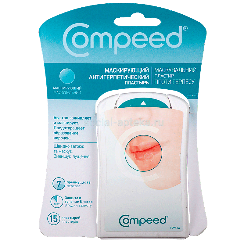 Маскирующий антигерпетический пластырь COMPEED® эффективно лечит на любой стадии герпетического высыпания: Стадия 1 - Жжение, зуд Начальная стадия характеризуется жжением или покалыванием в области губ или носа. Мгновенно уменьшает зуд и жжение Полностью локализуя герпетическое высыпание, COMPEED® мгновенно уменьшает покалывание, зуд и жжение. Пластырь защищает нервные окончания от контакта с воздухом и раздражения при движении губ. 92% участников клинического исследования подтвердили, что пластырь помогает уменьшить чувство покалывания, а 90% респондентов сообщили о том, что пластырь уменьшает жжение. Стадия 2 - Формирование пузырьков В течение 1-2 дней появляются первые признаки возникновения пузырьков и волдырей. Пластырь делает зону поражения незаметной, придавая уверенность в себе. Герпетические высыпания становятся невидимыми после нанесения на них Маскирующего антигерпетического пластыря CoOMPEED®. Фактически, пластырь COMPEED® настолько незаметный, что поверх него может легко наноситься декоративная косметика. 88% участников клинического исследования* подтвердили, что маскирующий антигерпетический пластырь COMPEED® делает высыпания менее заметными, по сравнению с другими способами лечения. Стадия 3 - Вскрытие пузырьков, образование эрозий. На этой стадии пузырьки лопаются, на их месте образуются неглубокие красноватые язвы. Это наиболее болезненный и заразный период. Гигиенично локализует высыпание. Маскирующий антигерпетический пластырь COMPEED® продолжает успокаивать кожу во время этой болезненной стадии, а также способен предотвратить распространение вируса за счет гигиенической изоляции ранки. Благодаря гигиенической изоляции, пластырь препятствует прикосновению руками к ранке, а также снижает риск перекрестного заражения. Пластырь предотвращает попадание на герпетическое высыпание воды, бактерий, грязи и посторонних инфекций. 82% участников клинического исследования* подтвердили, что благодаря пластырю, они перестали трогать ранку руками. Стадия 4 - Формирование корочек. Поверх ранки появляется сухая коричневатая корочка. Если она трескается, возникают ощущения зуда, жжения, ранка начинает кровоточить. Заживление происходит в оптимально увлажненной среде, которая предотвращает формирование корочки. Маскирующий антигерпетический пластырь COMPEED® адсорбирует излишнюю жидкость с раневой поверхности, сохраняя при этом частичный воздухообмен. Таким образом создается среда увлажненности, оптимальная для заживления кожи, что предотвращает образование корочки. У 81% участников клинического исследования* во время использования пластыря COMPEED® корочка не образовалась. Стадия 5 - Заживление Если корочка сформировалась, она отпадает во время этой стадии. Заживление происходит быстрее 65% участников клинического исследования* подтвердили более быстрое заживление герпетического высыпания с маскирующим антигерпетическим пластырем COMPEED®, по сравнению с другими способами лечения.