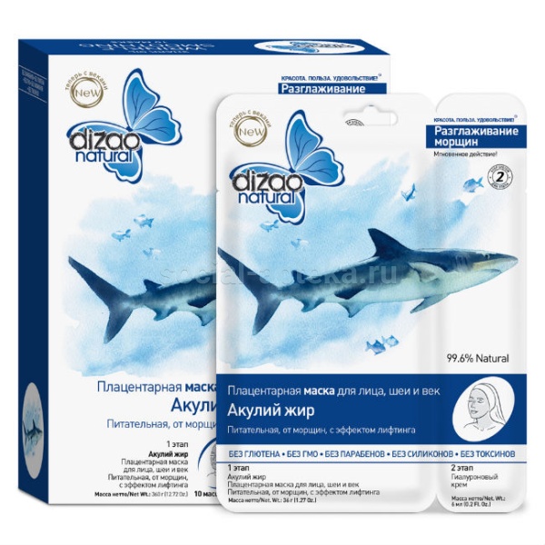 Маска для лица, шеи, век. Акулий жир. Плацентарная маска. Питательная, от морщин, с эффектом лифтинга. 2 этап: Гиалуроновый крем. Классические маски Dizao Natural содержат 99,6% натуральных природных ингредиентов, а их эффект сравним с посещением косметического салона. Маски классической серии двухэтапные и содержат гиалуроновый крем, увлажняющие кожу и усиливающие эффект маски. Бренд Dizao, является несомненным лидером в нише тканевых косметических масок, потому что всегда предлагает своим потребителям самые лучшие решения. Разработчики масок Dizao хорошо знают потребности современной женщины, так как всегда внимательно изучают отзывы и пожелании своих потребителей, и в соответствии с ними постоянно совершенствуют свою продукцию. Дизао изменили форму лекала масок для лица и шеи! Теперь салфетка приобрела дополнительные детали для ухода за веками. С одной стороны это усовершенствование позволяет сделать применение маски более комплексным, так как дает возможность осуществлять единовременный уход, как за кожей лица и шеи, так и за областью глаз. А с другой стороны позволяет легче адаптировать салфетку к индивидуальным особенностям лица. Во-вторых, Дизао изменили второй этап масок, теперь это гиалуроновый крем! В отличие от предшествующего второго этапа – Натур керамидов с гиалуроновой кислотой, также дает преимущество комплексного использования, так как не требует дополнительного применения крема после нанесения керамидов. Уникальное сочетание ценных ингредиентов помогает сохранить естественную красоту, заставляя кожу выглядеть ухоженной и подтянутой, приносит максимальную пользу, снабжая кожу питательными веществами и устраняя морщины, дарит удовольствие, обеспечивая приятные ощущения во время нанесения маски. 1 этап: Плацентарная маска для лица и шеи от морщин с эффектом лифтинга Как действует маска? укрепляет и подтягивает кожу. увлажняет заметно сокращает морщины повышает иммунитет кожи. Результат: моделируется овал лица, кожа омолаживается и наполняется жизненной энергией. 2 этап: Гиалуроновый крем Действие: интенсивно увлажняет и повышает упругость кожи. после применения маски нанести гиалуроновый крем тонким слоем и дать полностью впитаться. Преимущества: 99,6% натуральных ингредиентов Содержит растительный коллаген и растительную гиалуроновую кислоту СПА-эффект: восстановление, моделирование лица Экспресс-лифтинг Не содержит парабенов, ГМО, продуктов нефтехимии Экологичная удобная упаковка