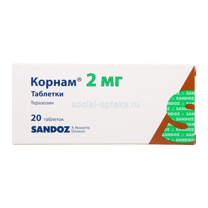 При одновременном применении Корнама и бета-адреноблокаторов, диуретиков, блокаторов кальциевых каналов, ингибиторов АПФ антигипертензивный эффект может усиливаться. Требуется особая осторожность при одновременном назначении теразозина и антигипертензивных препаратов центрального действия.Всасывание теразозина снижается при одновременном приеме адсорбентов и антацидов.Адреномиметики ослабляют эффект теразозина.При одновременном применении теразозина и НПВС возможно снижение антигипертензивного действия вследствие подавления синтеза простагландинов и задержки жидкости и ионов натрия.