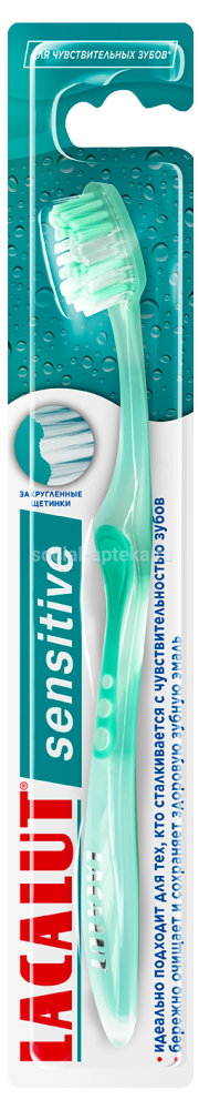 Описание и свойства Зубная щетка LACALUT sensitive рекомендуется для чувствительных зубов, имеет очень мягкие, закругленные щетинки Supersoft. Зубная щетка LACALUT sensitive имеет волнообразный профиль для чистки межзубных поверхностей и оголенной пришеечной области. Щетка обеспечивает деликатное и качественное удаление налета с удаленных участков коренных зубов за счет клиновидной головки.