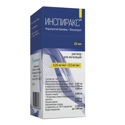 Препарат Инспиракс® содержит два компонента, обладающих бронхолитической активностью: ипратропия бромид - М-холиноблокатор и фенотерол - β2-адреномиметик. Бронходилатация при ингаляционном введении ипратропия бромида обусловлена, главным образом, местным, а не системным антихолинергическим действием. Ипратропия бромид является четвертичным производным аммония, обладающим антихолинергическими (парасимпатолитическими) свойствами. Препарат тормозит рефлексы, вызываемые блуждающим нервом, противодействуя влияниям ацетилхолина - медиатора, высвобождающегося из окончаний блуждающего нерва. Антихолинергические средства предотвращают увеличение внутриклеточной концентрации Са2+, что происходит вследствие взаимодействия ацетилхолина с мускариновым рецептором, расположенным на гладких мышцах бронхов. Высвобождение Са2+ опосредуется системой вторичных медиаторов, в число которых входят ИТФ (инозитола трифосфат) и ДАГ (диацилглицерин). У пациентов с бронхоспазмом, связанным с хроническими обструктивными заболеваниями легких (хронический бронхит и эмфизема легких), значительное улучшение функции легких (увеличение объема форсированного выдоха за 1 сек (OФB1) и пиковой скорости выдоха на 15% и более) отмечено в течение 15 минут, максимальный эффект достигался через 1-2 часа и продолжался у большинства пациентов до 6 часов после введения. Ипратропия бромид не оказывает отрицательного влияния на секрецию слизи в дыхательных путях, мукоцилиарный клиренс и газообмен. Фенотерол избирательно стимулирует β2-адренорецепторы в терапевтической дозе. Стимуляция β2-адренорецепторов активирует аденилатциклазу через стимуляцию Gs-белка. Стимуляция β1-адренорецепторов происходит при использовании высоких доз. Фенотерол расслабляет гладкую мускулатуру бронхов и сосудов и противодействует развитию бронхоспастических реакций, обусловленных влиянием гистамина, метахолина, холодного воздуха и аллергенов (реакции гиперчувствительности немедленного типа). Сразу после введения фенотерол блокирует высвобождение медиаторов воспаления и бронхообструкции из тучных клеток. Кроме того, при использовании фенотерола в дозах 0,6 мг, отмечалось усиление мукоцилиарного клиренса. β-адренергическое влияние препарата на сердечную деятельность, такое как увеличение частоты и силы сердечных сокращений, обусловлено сосудистым действием фенотерола, стимуляцией β2-адренорецепторов сердца, а при использовании доз, превышающих терапевтические, стимуляцией β1-адренорецепторов. Как и при использовании других β-адренергических препаратов отмечалось удлинение интервала QTс при использовании высоких доз. При использовании фенотерола с помощью дозированных аэрозольных ингаляторов (ДАИ) этот эффект был непостоянным и отмечался в случае применения доз, превышавших рекомендуемые. Однако после применения фенотерола с помощью небулайзеров (раствор для ингаляций во флаконах со стандартной дозой) системное воздействие может быть выше, чем при использовании препарата с помощью ДАИ в рекомендуемых дозах. Клиническое значение этих наблюдений не установлено. Наиболее часто наблюдаемым эффектом агонистов β-адренорецепторов является тремор. В отличие от воздействий на гладкие мышцы бронхов, к системным влияниям агонистов β-адренорецепторов может развива