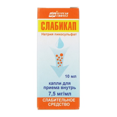 Слабикап - слабительное средство. Уменьшает всасывание электролитов и воды, усиливает перистальтику кишечника. Активная форма препарата, образующаяся путем гидролиза под влиянием кишечных микроорганизмов, непосредственно возбуждает нервные структуры кишечной стенки, в результате чего ускоряется продвижение кишечного содержимого. Действие наступает через 10 - 12 ч после приема.Фармакокинетика После приема внутрь не всасывается из желудочно-кишечного тракта и не подвергается печеночно-кишечной циркуляции.