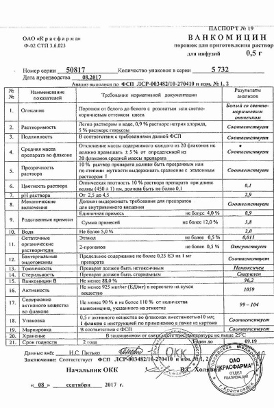 Характеристика: Трициклический гликопептидный природный антибиотик Фармгруппа: антибиотик-гликопептид. Фармдействие: Антибиотик-гликопептид, продуцируемый Amycolatopsis orientalis, действует бактерицидно на большинство микроорганизмов (на Enterococcus spp. - бактериостатически). Блокирует синтез клеточной стенки бактерий в участке, отличном от того, на который действуют пенициллины и цефалоспорины (не конкурирует с ними за участки связывания), прочно связываясь с D-аланил-D-аланиновыми остатками субъединиц пептидогликана - основного компонента клеточной стенки, что приводит к лизису клетки. Активен в отношении грамположительных микроорганизмов: Staphylococcus spp. (включая пенициллиназообразующие и метициллинорезистентные штаммы), Streptococcus spp., Streptococcus pneumoniae (включая штаммы, резистентные к пенициллину), Corynebacterium spp., Enterococcus spp., Clostridium spp., Actinomyces spp. Оптимум действия - при pH 8, при снижении pH до 6 эффект резко уменьшается. Активно действует только на микроорганизмы, находящиеся в стадии размножения. Устойчивы почти все грамотрицательные бактерии, Mycobacterium spp., грибы, вирусы, простейшие. Не имеет перекрестной резистентности с др. антибиотиками. Фармакокинетика: Плохо абсорбируется при приеме внутрь. При интраперитонеальном введении возможно системное всасывание до 60% (при введении в дозе 30 мг/кг концентрация в плазме - около 10 мг/кг). Около 60% дозы абсорбируется через 6 ч. Связь с белками плазмы - 55%. После в/в введения объем распределения - 0.39-0.92 л/кг. Cmax после в/в инфузии 500 мг - 49 мкг/мл через 30 мин и 20 мкг/кг через 1-2 ч; после в/в инфузии 1 г - 63 мкг/мл через 60 мин и 23-30 мкг/мл через 1-2 ч. Терапевтические концентрации определяются в асцитической, синовиальной, плевральной и перикардиальной жидкостях, в жидкости перитонеального диализата, в моче, ткани ушка предсердия. Не проникает через ГЭБ (при менингите обнаруживается в ликворе в терапевтических концентрациях). Проникает через плаценту. Выделяется с грудным молоком. Практически не метаболизируется. T1/2 при нормальной функции почек: взрослые - около 6 ч (4-11 ч), новорожденные - 6-10 ч, грудные дети - 4 ч, дети более старшего возраста - 2-3 ч; T1/2 при ХПН (олигурия или анурия) у взрослых - 6-10 дней. При многократном введении возможна кумуляция, 75-90% препарата выводится почками путем пассивной фильтрации в первые 24 ч; у пациентов с удаленной или отсутствующей почкой выводится медленно и механизм выведения неизвестен. В небольших и умеренных количествах может выводиться с желчью. В незначительных количествах выводится при гемодиализе или перитонеальном диализе.