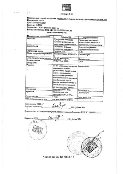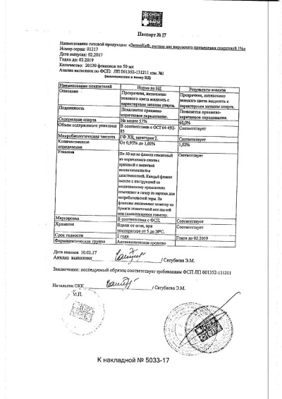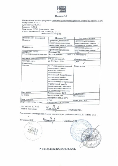 Действующее вещество: бриллиантовый зеленый-1,0 г. Вспомогательные вещества: этанол (спирт этиловый) 95% - 56,0 г, вода очищенная до 100 мл.