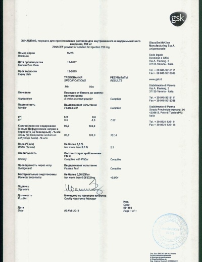 С осторожностью следует назначать препарат пациентам с анафилактической реакцией на пенициллины и другие бета-лактамные антибиотики в анамнезе.При одновременном приеме с аминогликозидами и диуретиками повышается риск возникновения нефротоксических эффектов, поэтому необходимо контролировать функцию почек при применении такой комбинации препаратов, особенно у пациентов пожилого возраста, с заболеваниями почек и у получающих препарат в высокой дозе.При лечении менингита Зинацефом у некоторых детей отмечалось снижение слуха легкой и средней степени тяжести, при этом в цереброспинальной жидкости определялись положительные культуры Haemophilus influenzae через 18-36 ч терапии. Подобные явления отмечались также при применении других антибиотиков, их клиническое значение не известно.Псевдомембранозный колит наблюдается при использовании широкого спектра антибиотиков, возможность его возникновения необходимо иметь в виду у пациентов с тяжелой диареей, возникшей во время или после курса лечения антибиотиками.Цефуроксим выпускается также в форме аксетила (Зиннат) в таблетках, что позволяет назначать последовательно один и тот же антибиотик, когда необходим переход с парентеральной на пероральную терапию.Для лечении пневмонии и обострения хронического бронхита эффективным является назначение курса лечения Зинацефом, антибиотиком для парентерального введения, перед применением Зинната внутрь (методика ступенчатой терапии).При ступенчатой терапии время перехода на пероральную терапию определяется тяжестью инфекции, клиническим состоянием пациентов и чувствительностью возбудителя. Если нет клинического эффекта в пределах 72 ч от начала лечения, парентеральный курс терапии должен быть продолжен.Перед началом ступенчатой терапии обратитесь за информацией в имеющиеся справочники по поводу цефуроксима аксетила.Зинацеф не влияет на результаты определения глюкозы в моче с помощью ферментных методов. Однако, при применении других методов (Бенедикта, Фелинга, Клинитест) может быть взаимодействие, не приводящее к ложноположительным результатам.У пациентов, получающих Зинацеф, рекомендуется использовать для определения уровня глюкозы в крови/плазме метод с глюкозооксидазой или с гексокиназой.Зинацеф не влияет на количественное определение креатинина щелочно-пикратным методом.В каждом флаконе Зинацефа по 750 мг содержится 42 мг натрия.Влияние на способность управлять транспортными средствами и другими механизмами, требующими повышенной концентрации вниманияНет сообщений.
